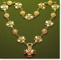 Знак президента – символ президентской власти в РФ – состоит из знака и цепи знака. Знак является символической копией ордена «За заслуги перед Отечеством» I степени и представляет собой золотой крест с расширяющимися концами, покрытый с лицевой стороны рубиновой эмалью. В центре креста – накладное изображение Государственного герба РФ. На оборотной стороне креста посередине – круглый медальон, по окружности которого написан девиз: «Польза, честь и слава».