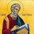 Святой апостол и евангелист Матфей принадлежит к числу 12-ти апостолов. В Священном Писании он также называется Левием (Лк. 5, 27). Апостол Матфей был братом апостола Иакова Алфеева и, до своего призвания в апостольский чин, был Галилейским мытарем, т.е. сборщиком податей. После призвания Господом, он, оставив все, последовал за Спасителем. С тех пор св. Матфей вместе с другими учениками Иисуса Христа пребывал с Ним неотлучно.